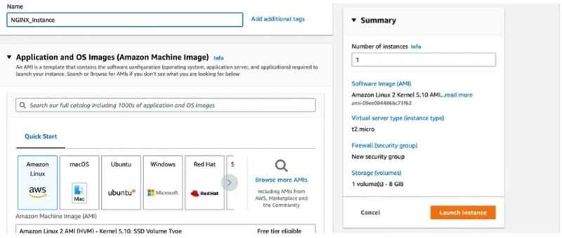 For this tutorial, we’ll name our instance “NGINX_Instance” and select Amazon Linux 2 AMI, which is eligible for the Free Tier, as our base image—just as shown in the illustration below.