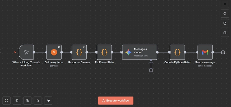 As you can see, a simple newsletter sending in n8n requires fetching, cleaning the output from both API and LLM and then sending i.e. 7 nodes with low quality formatting (manual plumbing required).