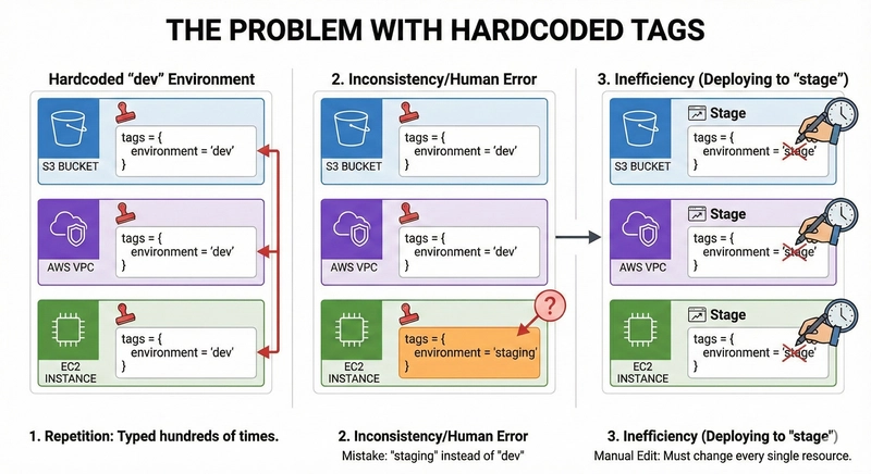 Imagine defining multiple resources such as: S3 bucket, an AWS VPC, and an EC2 instance, all intended for a “dev” environment. If you hardcode environment = dev into the tags of all three resources, you face several challenges: