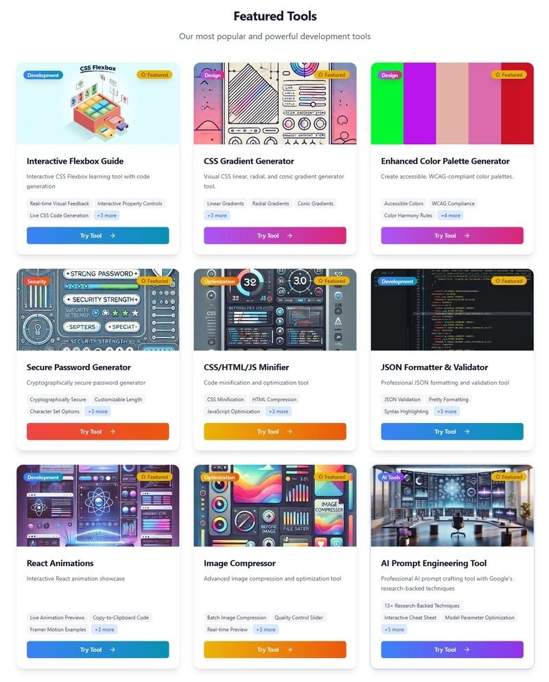 Architecture: The tools are built as modular React components with a focus on performance and user experience. Each tool is self-contained, works offline, and processes data client-side for privacy and speed.