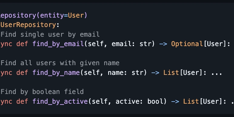 What about custom queries? For common WHERE clauses, you don’t need to write SQL. Mitsuki includes a Query DSL (Domain-Specific Language) that generates queries by parsing method names.