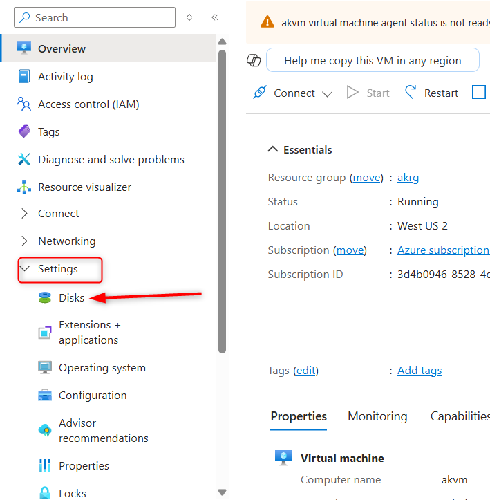 1.Come to the overview of your Virtual Machine and click settings and select disk