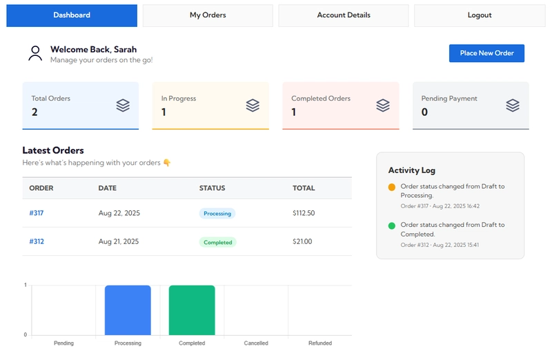 The default WooCommerce “My Account” page shows customers a greeting and a vertical list of text links. That’s it. No order statistics. No visual hierarchy. No indication of order status. Nothing that makes customers feel informed or in control.