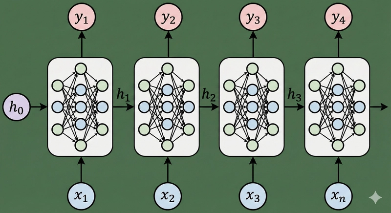 Before the “Attention Is All You Need” paper, the standard for processing sequential data (like text) was the Recurrent Neural Network (RNN).In an RNN, data is processed sequentially. We give the network an initial state (State 0) along with an input x1 to produce an output y1 and a hidden state. This hidden state is passed forward to the next step, allowing the network to “remember” previous inputs.