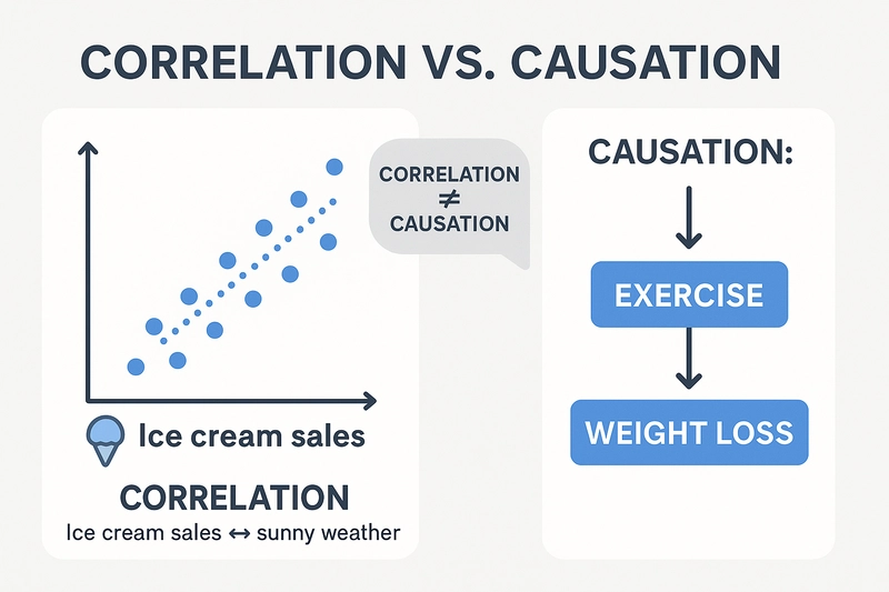 | Correlation | Two variables change together, but one doesn’t necessarily cause the other. | Number of firefighters and fire damage — both rise together, but fires cause both. |