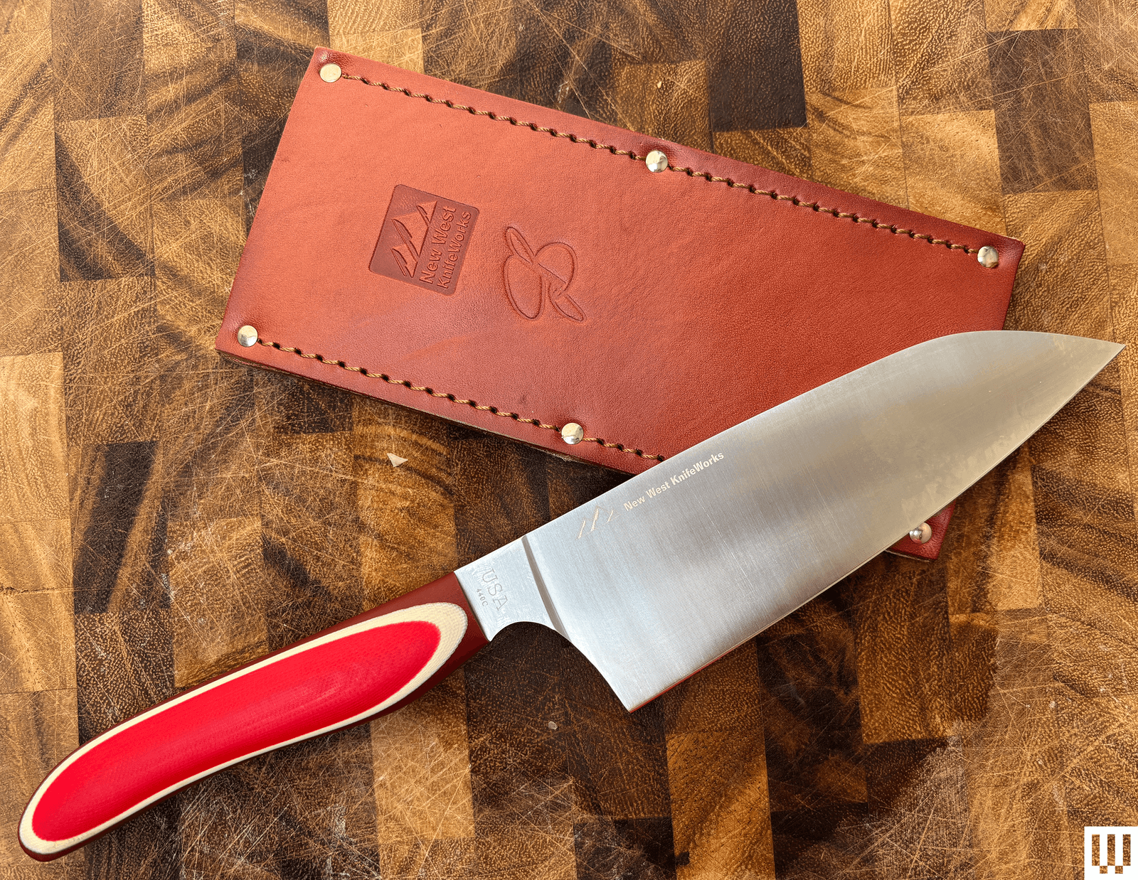 New West Knifeworks Joy Bauer 6-Inch Chef Knife for $225: Like my New West Knifeworks pick above, this luxe knife is absolutely gorgeous, with a bold red-and-white handle and an accompanying embossed leather sheath. Created in collaboration with nutritionist and TV personality Joy Bauer, this 6-inch knife is a Japanese Santoku-style knife with a downward blade and a sturdy top slope, made from American-made 440C stainless steel. I found that food stuck to the sides of this blade, and it dragged more with starchier foods, but it is absolutely gorgeous and better for smaller tasks.