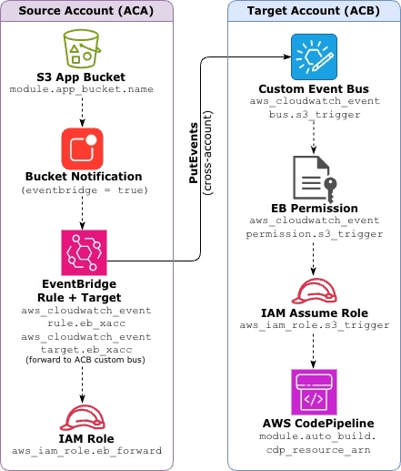 • ACB’s EventBridge rule assumes a dedicated “start-pipeline” role