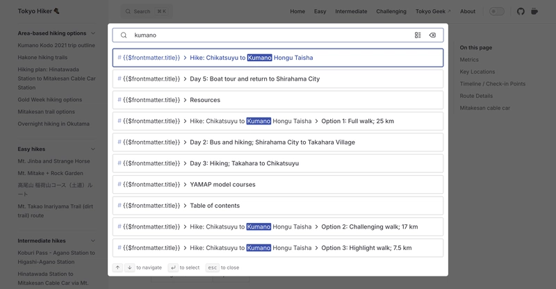 For example, if your page heading uses the $frontmatter template global, the local search index can treat the expression as plain text. Your search results may then show something like {{ $frontmatter.title }} instead of the actual page title.